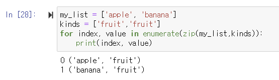 ▶️ my_list 값과 kinds 각각을 연결하고 index까지 부여하고 싶을 때, enumerate와 zip을 함께 사용할 수 있음