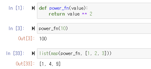 ▶️ power_fn 사용자 정의 함수값을 이용해 [1, 2, 3]에 함수를 적용해 각각의 제곱값을 출력함