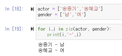 ▶️ actor와 gender를 zip으로 묶어 각각 i와 j에 저장한 후 출력하면 (송중기, 남)이 하나에, (송혜교, 여)가 하나에 따로 출력됨