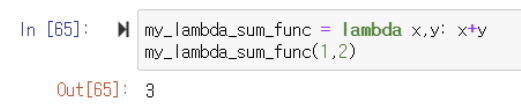 ▶️ my_lambda_sum_func 변수를 생성해 lambda 매개변수(x, y) : 실행문(x+y)를 저장함
