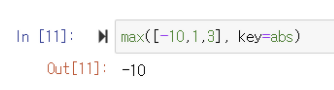 ▶️ 함수로 지정된 abs는 absolute, 즉 절대값을 의미하기 때문에 최대값으로 -10을 출력함