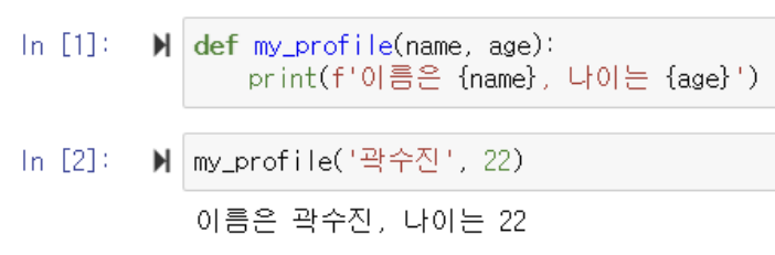 ▶️ my_profile 함수를 생성해 parameter로 name과 age를 지정함