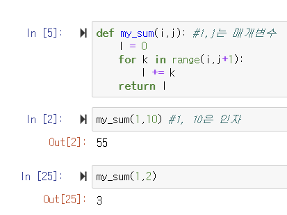 ▶️ def my_sum(i,j) : i와 j는 매개변수(parameter)로 지정함