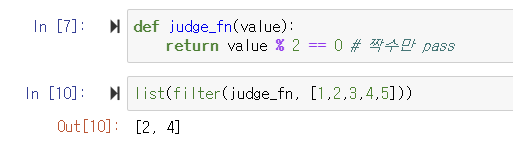 ▶️ value 값을 2로 나눈 나머지가 0, 즉 짝수일 경우에 사용자 정의 함수 내에서 [1, 2, 3, 4, 5] 중 true로 판정되는 값을 출력함