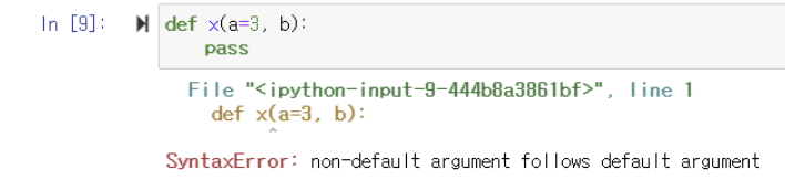 ▶️ 앞에 있는 a값에는 default를 지정했지만 뒤에 있는 b에는 default를 지정해주지 않아 오류가 발생함