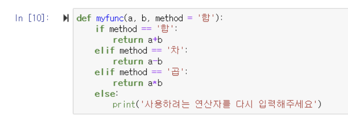 ▶️ 위에서 언급한 것처럼 method의 default 값으로 '합'을 지정해 두었기 때문에, method의 인자로 아무것도 입력하지 않으면 자동으로 '합'이 적용됨