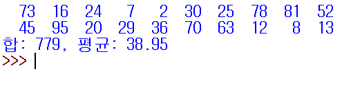 1~100 중 20개의 값을 랜덤으로 리스트에 저장하는 함수를 만들고, 한 라인에 10개씩 출력되도록 해야 하며 4자리를 확보해 출력하는 것으로 한다. 또, 리스트에 저장된 내용들의 합과 평균을 출력하는 함수를 만드는 프로그램을 작성해보자.