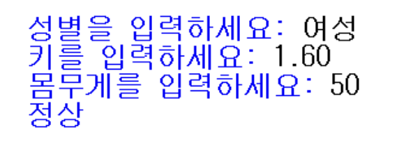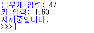 사용자로부터 키(m 단위)와 몸무게(kg 단위)를 입력받아 BMI를 구하고 18.5 미만이면 저체중, 18.5~22.9 사이면 정상, 23~24.9 사이면 과체중 25~29.9 사이면 경도비만, 30 이상이면 고도비만임을 출력하는 프로그램을 작성해보자.