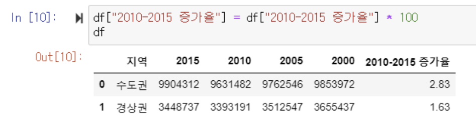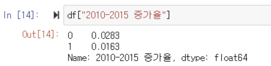 ▶️ 위와 같은 DataFrame에서 column값 중 '2010-2015 증가율'만 따로 출력함