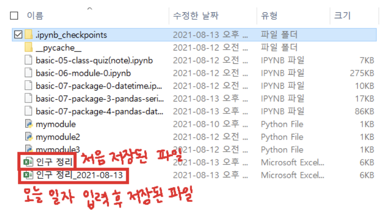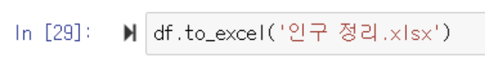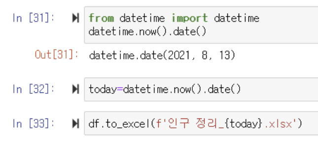 ▶️ 오늘 일자를 today 변수에 저장한 후 엑셀 파일에 저장할 때는 인구정리_오늘 일자 이름으로 저장