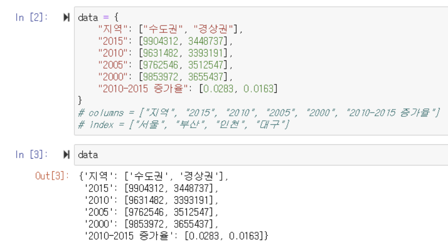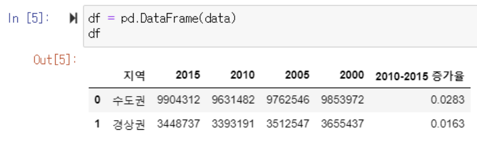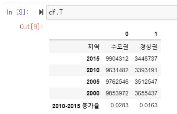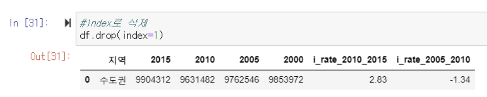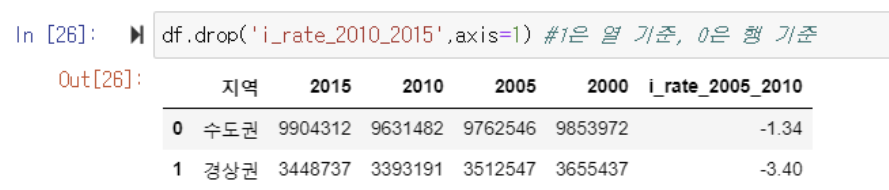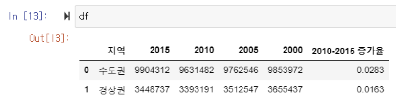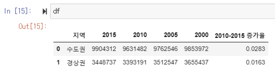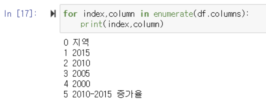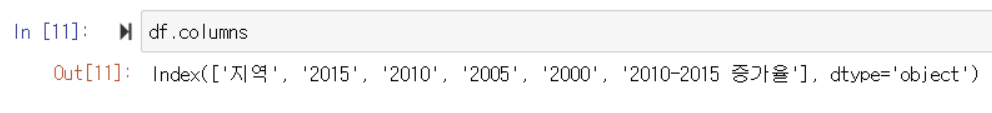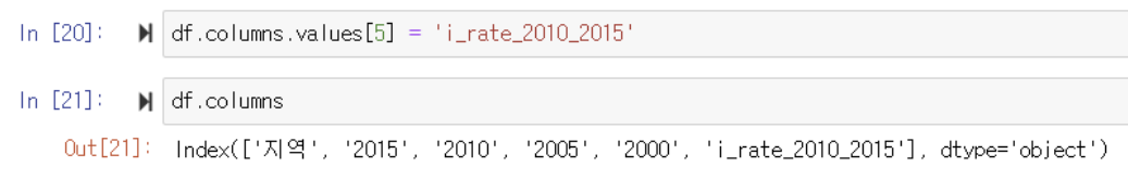 ⇒ df.columns = ['지역': '2015','2010','2005','2000','i_rate_2010_2015']으로도 표현이 가능하지만 column이 많은 경우에는 힘들기 때문에 지양함