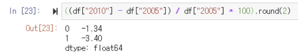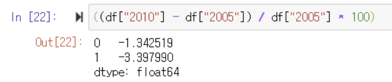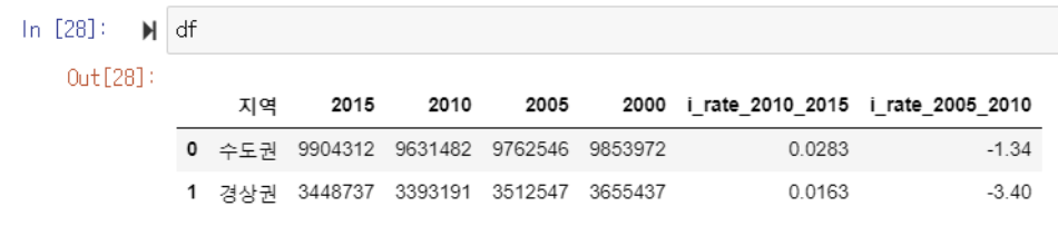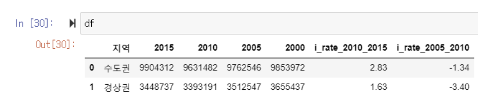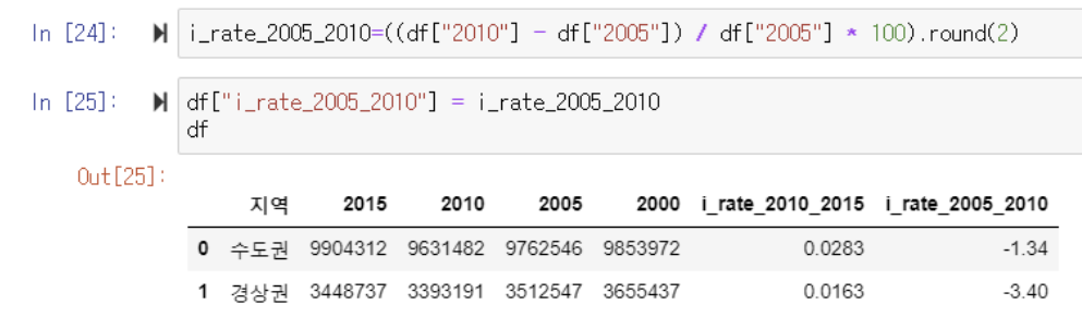 ▶️ 위와 같이 계산한 값을 i_rate_2005_2010 변수에 저장한 후 DataFrame에 저장 후 출력하면 column 하나가 새로 생성된 모습을 볼 수 있음