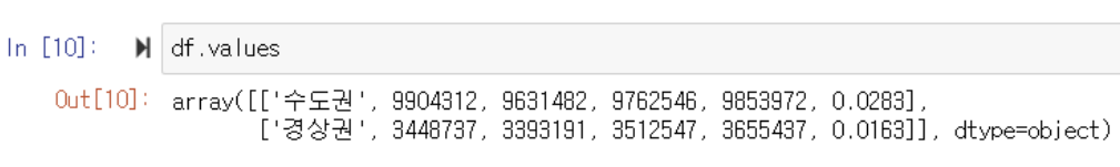 ▶️ 다시 일반 df을 출력했을 때, values값과 columns 값만 출력하는 방법은 아래와 같음