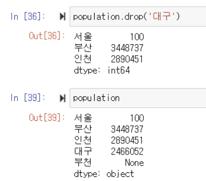 ▶️ 영구적으로 제거하기 위해서는 변수 하나를 새로 생성해 변수.drop('index명')을 저장하면 출력했을 때 사라진 모습을 볼 수 있음