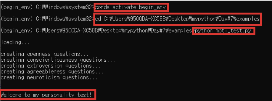 ▶️ cd C:\Users\9500DA-XC58B\Desktop\mypython\Day\7\examples : 위 코드가 작성된 파이썬 파일이 들어있는 폴더로 주소 변경하기