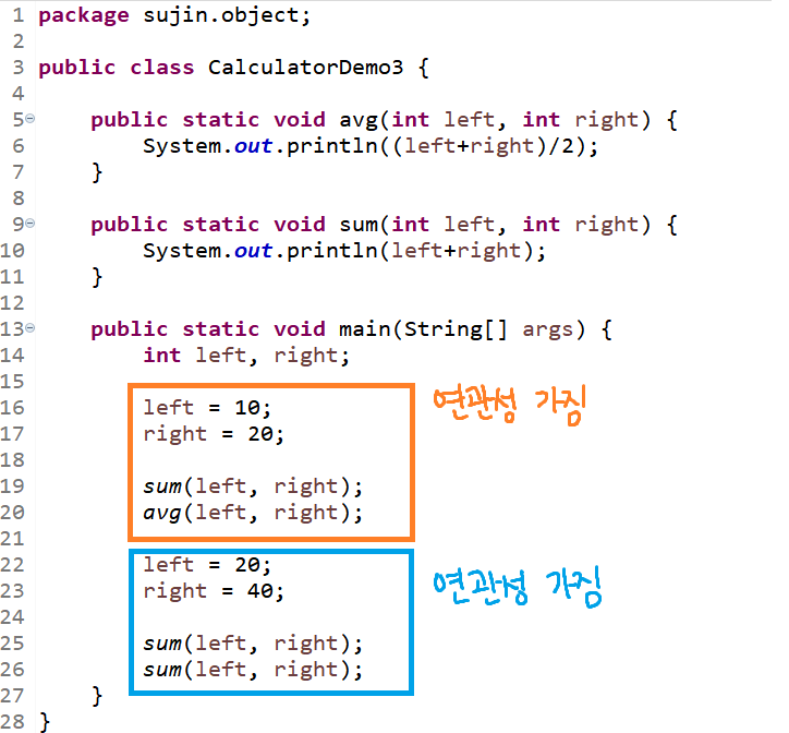 ▶️ class Calculator : 변수 left와 right, 메소드 sum과 avg는 연관되어 있는 로직으로, 이를 Calculator라는 이름으로 그룹핑해 클래스 생성