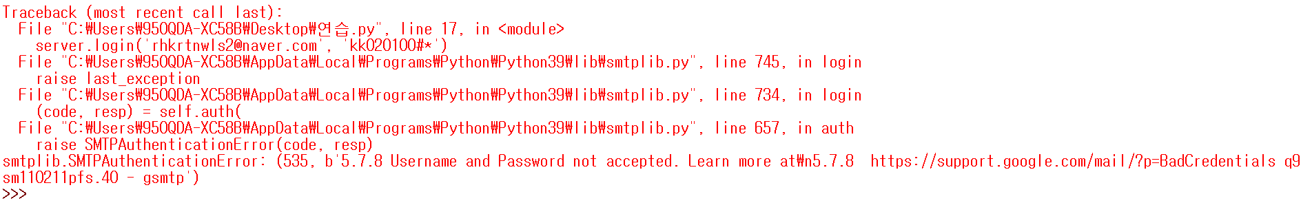 server.login('자신의 아이디', '패스워드') # 실제 자신의 구글 아이디와 비밀번호 입력