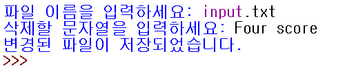 사용자로부터 파일 이름과 삭제할 문자열을 입력받고, 파일을 열어서 사용자가 원하는 문자열을 삭제한 후에 다시 파일에 쓰는 프로그램을 작성해보자.
