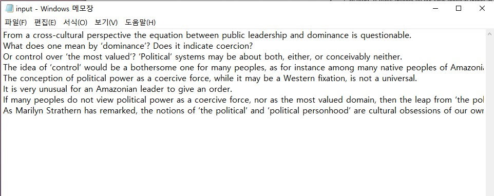 ▶ 입력 파일로부터 연설문을 한 문단(줄 바꿈이 발생하기 전)씩 가져와 단어별로 분리함