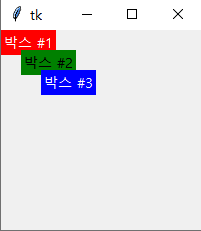 w = Label(window, text = '박스 #3', bg = 'blue', fg = 'white')