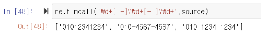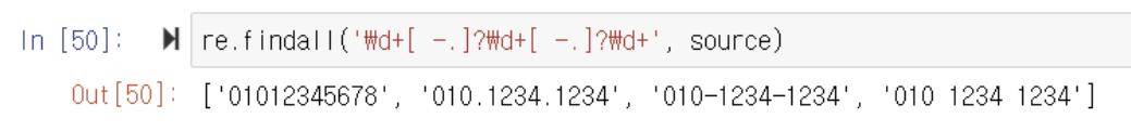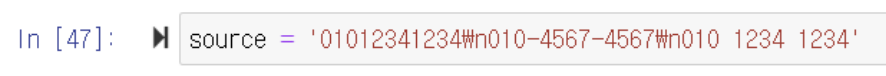 ▶️ 숫자가 한개 이상이고 공백, -가 있거나 없는 패턴의 전화번호 3개를 source에 저장함