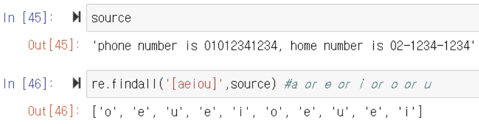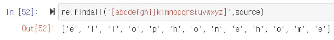 ▶️ 소문자 모음만 탐색하기 위해서 [a, e, i, o, u]를 지정했던것과 마찬가지로 [abcdefghijklmnopqrstuvwxyz] 모두 작성해도 알파벳 26글자를 모두 탐색할 수 있음