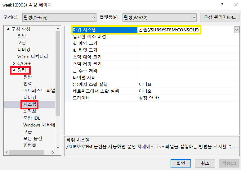 [프로젝트] - 마지막 [**속성] – 대화상자 왼쪽 목록에서 [링커] – [시스템] – 오른쪽 화면 의 첫 번째 항목 [하위시스템] - [콘솔]로 설정