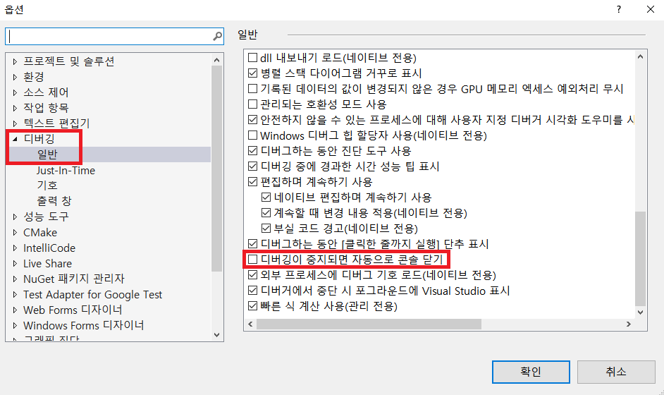 [도구] - [옵션] – 대화상자 왼쪽 목록에서 [디버깅] – [일반] – 오른쪽 나오는 목록들 중 에서 (디버깅을 종료하면 자동으로 콘솔닫기)에 체크