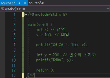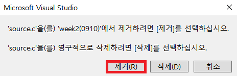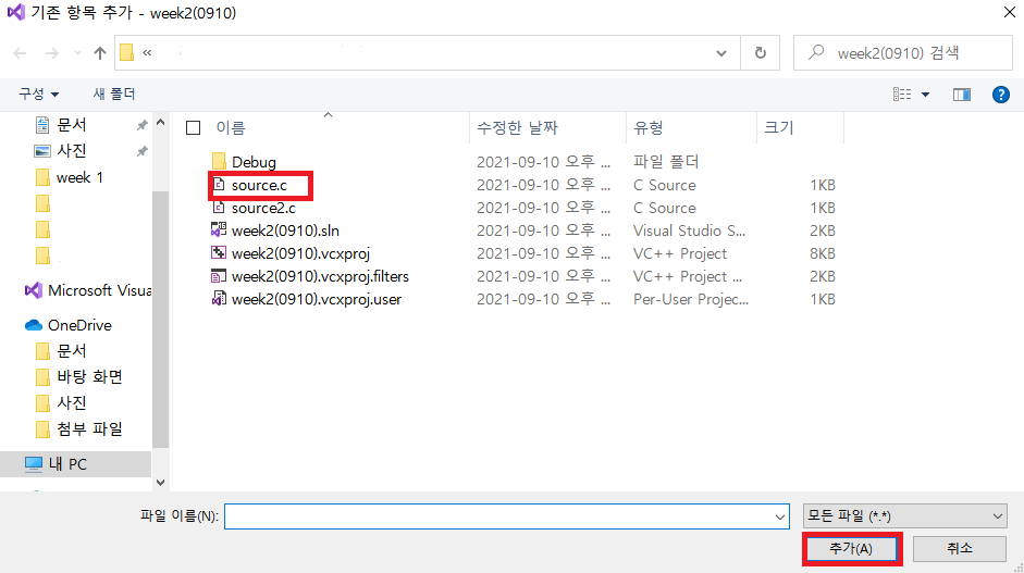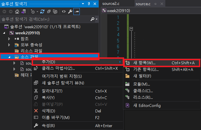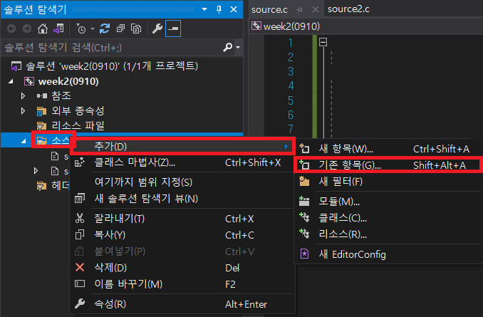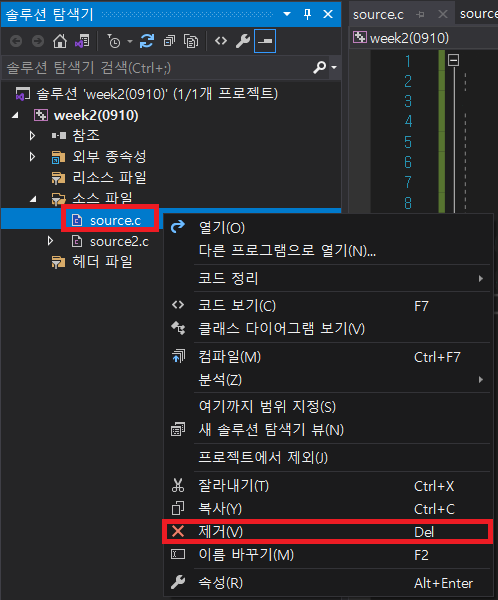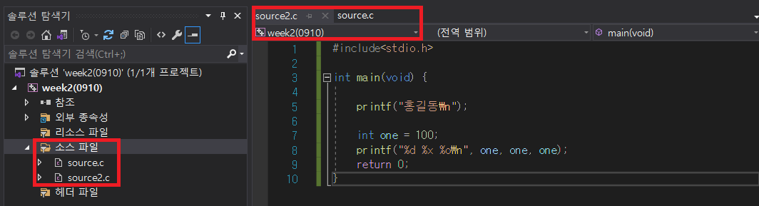▶ 위 사진을 보면 week2(0910) 하나의 프로젝트 내에 소스파일(source.c / source2.c) 2개가 들어있음