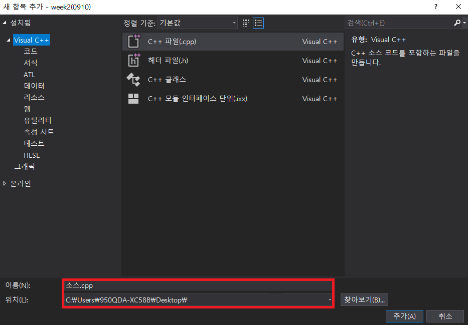 ▶ 솔루션 탐색기 → 소스 파일 → 추가 → 새 항목