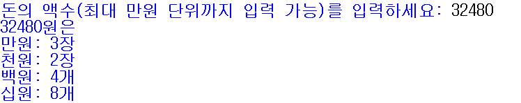Ex. 32480 입력시 만원 3장, 천원 2장, 백원 4개, 십원 8개 출력