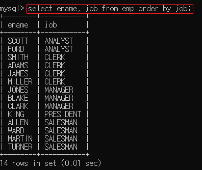 : emp에서 ename과 job을 job 기준 오름차순으로 정렬