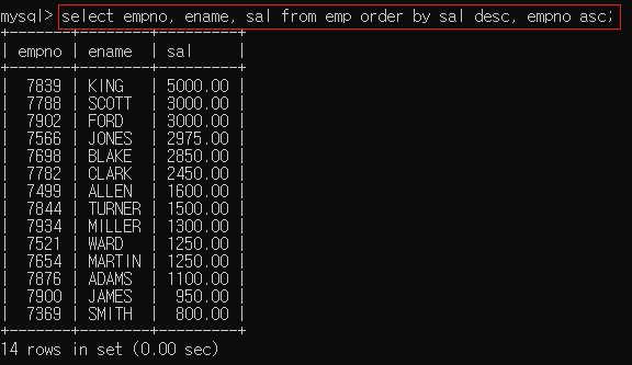 ▶ select empno, ename, sal from emp order by sal desc, empno asc;