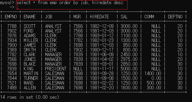 JOB을 기준으로 오름차순 정렬하고 JOB이 같으면 HIREDATE를 기준으로 내림차순 정렬해보자.