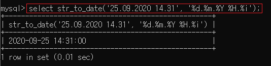 ▶ select str_to_date('25.09.2020 14.31', '%d.%m.%Y %H.%i');