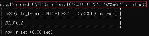 ▶ select CAST(date_format('2020-10-22', '%Y%m%d') as char);