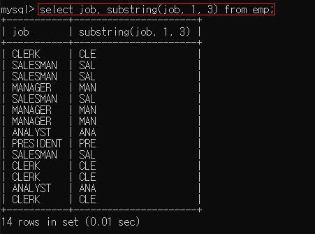 ▶ select job, substring(job, 1, 3) from emp;