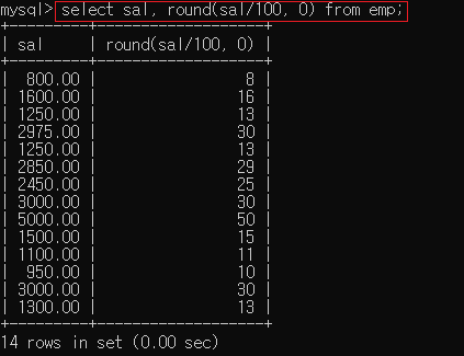 ▶ select sal, round(sal/100, 0) from emp;