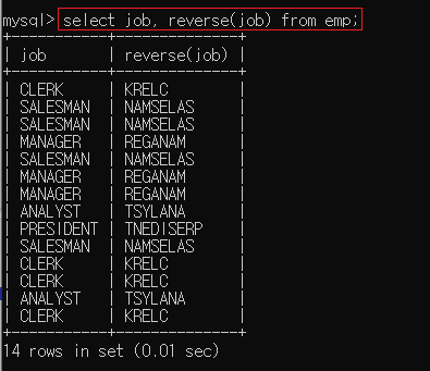 ▶ select job, reverse(job) from emp;
