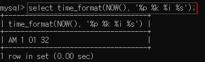 ▶ select time_format(NOW(), '%p %k %i %s');