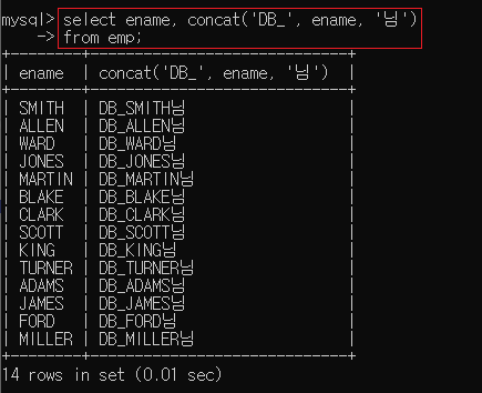 ▶ select ename concat('DB_', ename, '님') from emp;