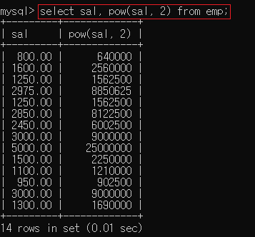 ▶ select sal, pow(sal, 2) from emp;