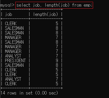 ▶ select job, length(job) from emp;