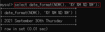▶ select date_format(NOW(), '%Y %M %D %W');