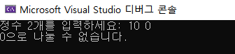 ▶ 사용자가 입력한 두 값을 나눴을 때 0이 나오면 '0으로 나눌 수 없습니다.' 출력