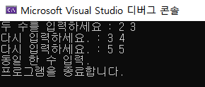 사용자에게 두 수를 입력받고 두 수가 같으면 입력을 중단하고