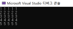 ▶ for(b=5; b>=1; b--) : 반복문이 수행되는 동안 한 줄에 5개씩 출력함(가로)