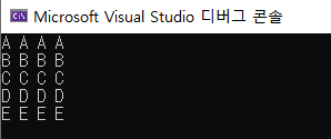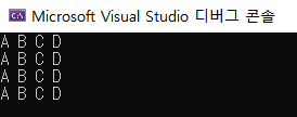 ▶ for (b='A'; b<='D'; b++) : 반복문이 수행되는 동안 한 줄에 4글자씩 출력(가로)