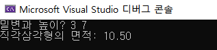 ▶ printf("직각삼각형의 면적: %.2f\n", cm * height * 0.5) : 직각삼각형의 면적은 소수점 둘째 자리 까지만 출력되도록 함