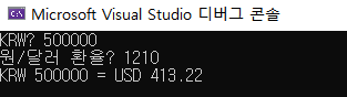 printf("KRW %d = USD %.2f\n", krw, usd);